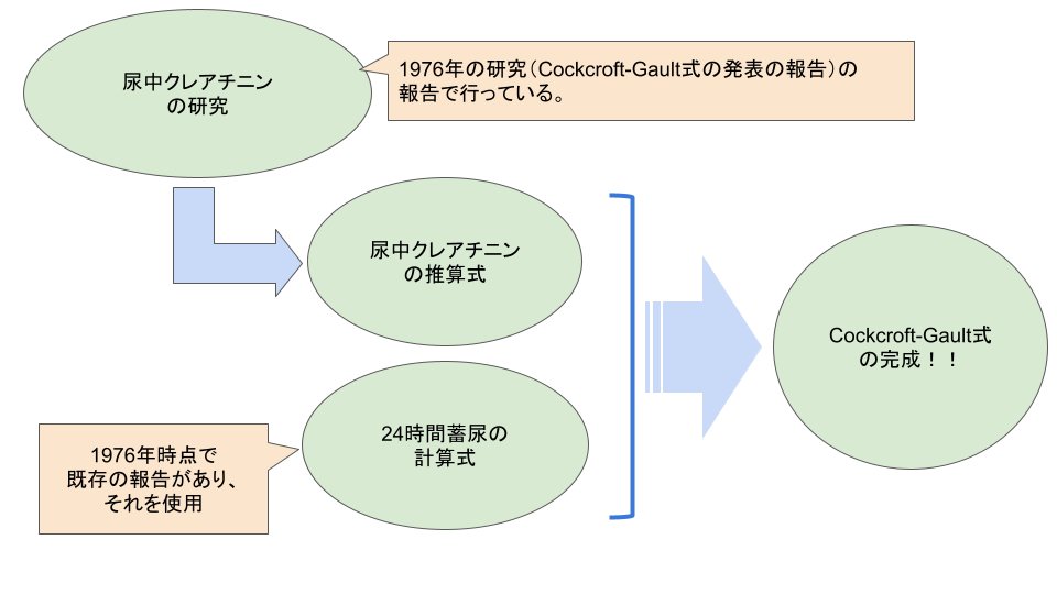 つまり、この報告では24時間の尿中クレアチニン分泌を測定→式を作成→その式を24時間蓄尿の式に代入して変換して作成しています。
